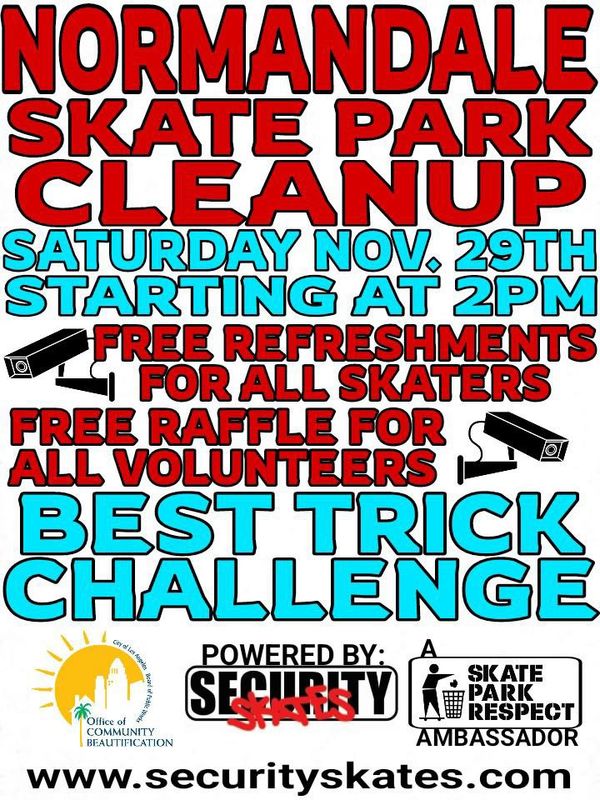 BROOMS, SHOVELS, SCRAPERS, TRASH BAGS, GLOVES AND FACE MASKS WILL BE AVAILABLE DURING THE CLEAN UP TO ALL VOLUNTEERS WHO WOULD LIKE TO PARTICIPATE! COME AND HELP MAKE A POSITIVE IMPACT AT THIS LOS ANGELES SKATE PARK!